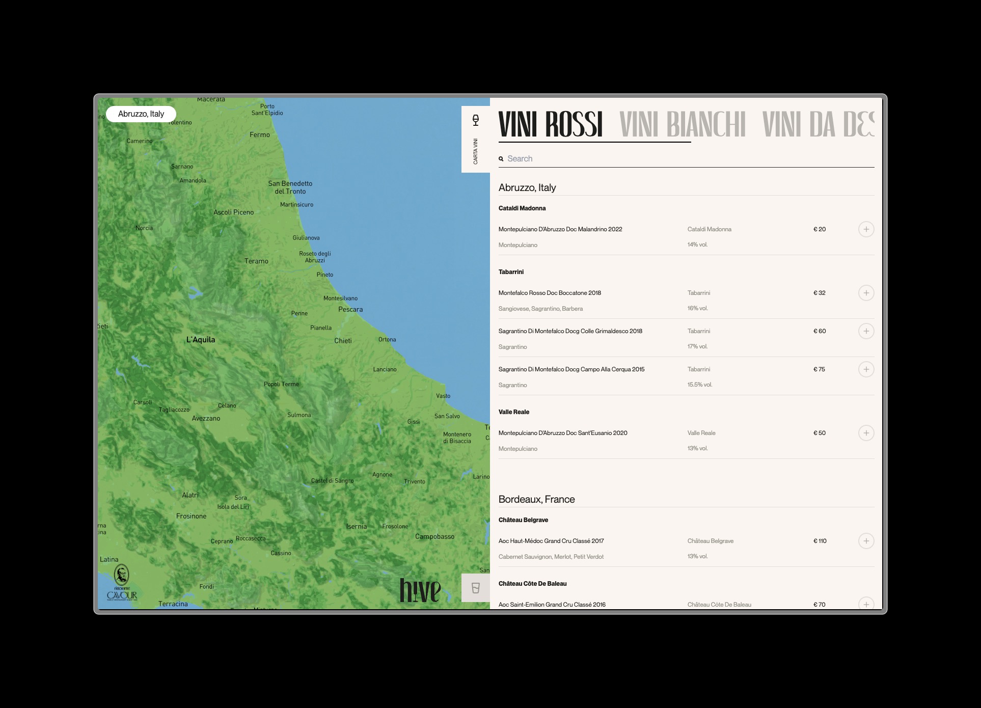 Con HIVE, ogni scelta diventa un'esperienza. La nostra webapp dal design curato e intuitivo presenta ogni bottiglia in modo coinvolgente, raccontandone la storia e le caratteristiche organolettiche. Gestisci la tua cantina in modo innovativo ed esclusivo, monitorando le giacenze e aggiornando prezzi e descrizioni con semplicità ed efficacia.